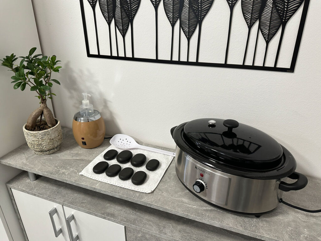 Masáž lávovými kameňmi je relaxačno–regeneračná masáž, pri ktorej sa využívajú hladké, najčastejšie čierne lávové (bazaltové- sopečné) kamene, zahriate na príjemnú teplotu približne 40–60 °C. Kamene sa prikladajú na vybrané body tela (chrbát, šija, dlane, chodidlá) a nechajú sa pôsobiť alebo sa nimi masíruje po olejom natretej pokožke. Využívajú sa hmaty klasickej masáže. Pridaná hodnota tejto masáže je vo využití väčšieho tlaku pomocou kameňov, využitia tepla z kameňov na stuhnuté svaloy, zvýšené uvoľnenie napätia v chladných mesiacoch.